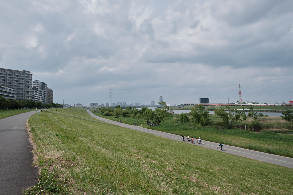 The Arakawa River route offers one of the longest continuous cycling paths in the city. The path stretches along wide riverbanks designed to control seasonal flooding.